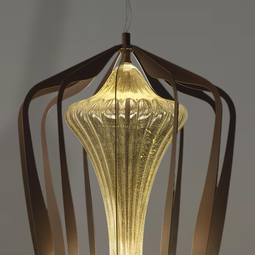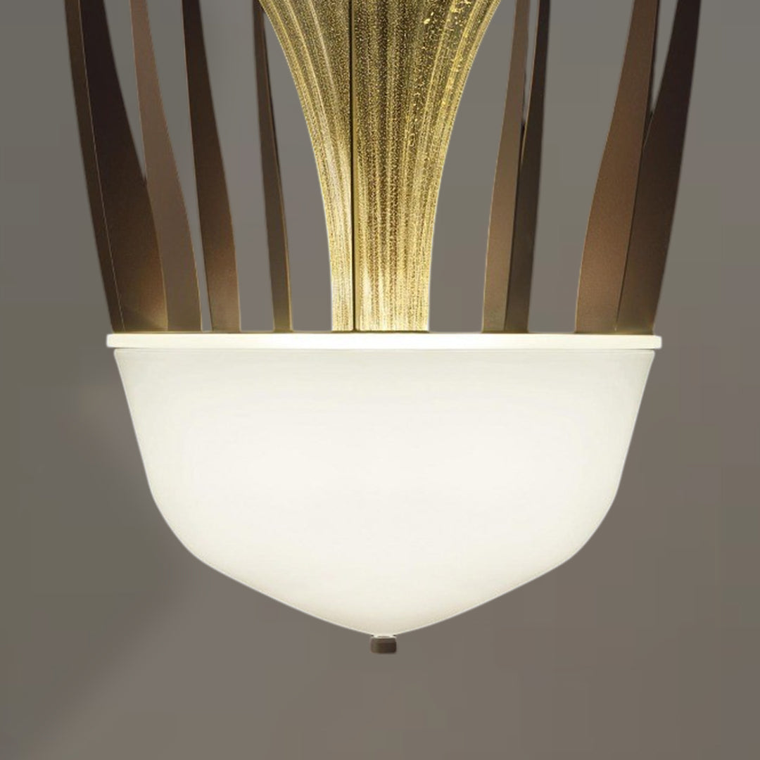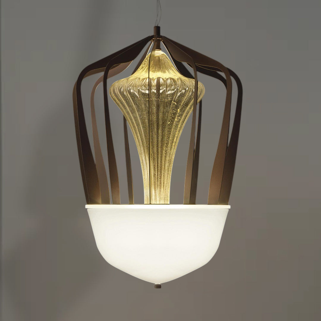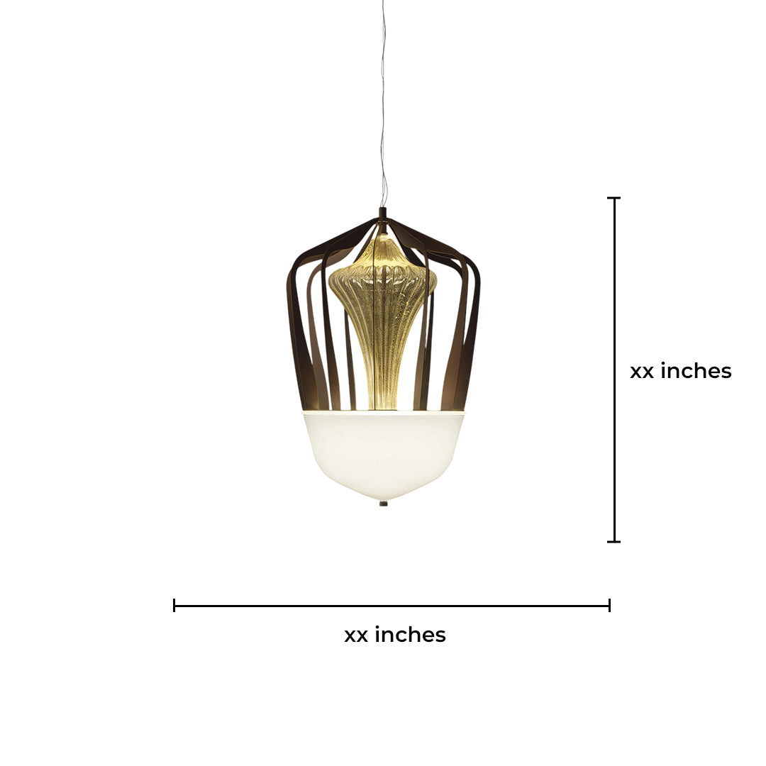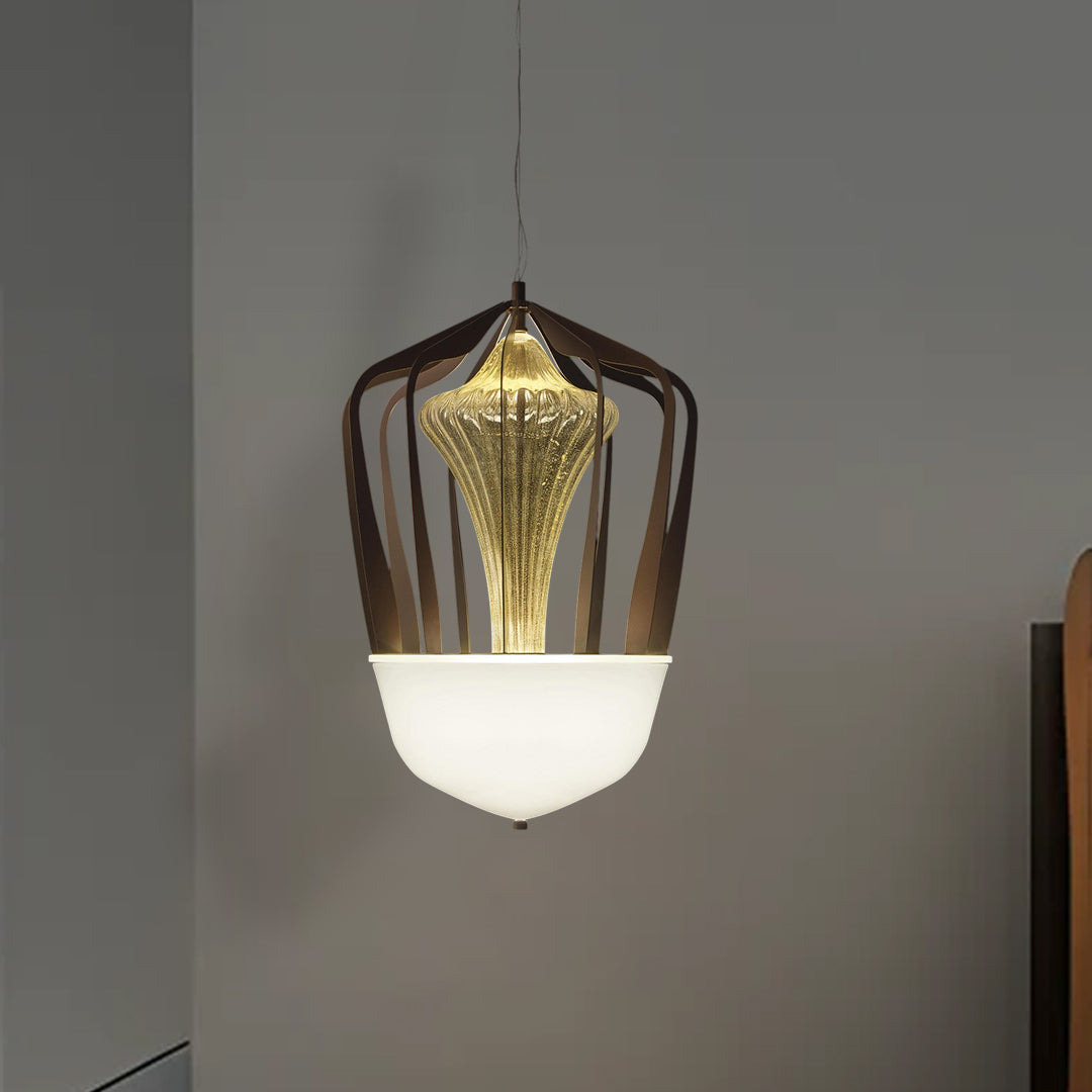 This striking Lotus Pendant merges sculptural flair with functional elegance. Its artistic silhouette features a handblown glass center, gracefully enclosed in bold bronze-like metal ribs and crowned with a soft white diffuser.